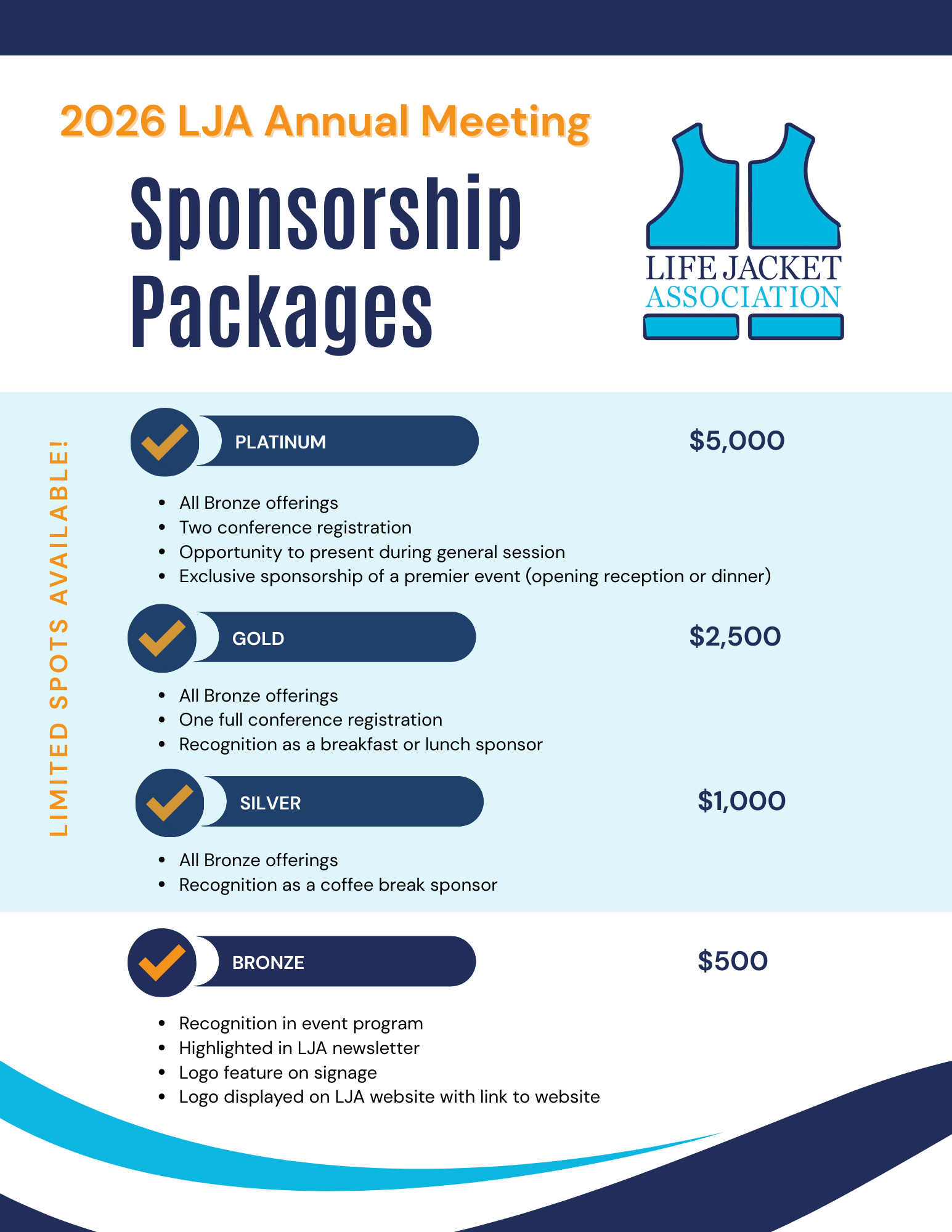Join us in advancing water safety and life jacket innovation by sponsoring the Life Jacket Association Annual Meeting.